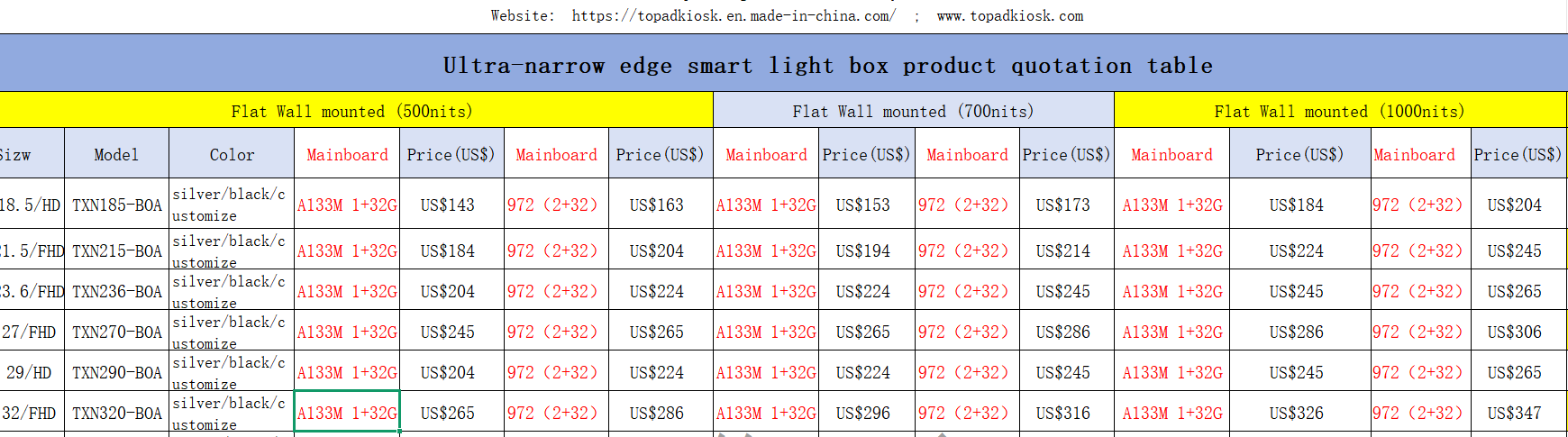 Търсите надежден 4K тесен рамка на закрита стена, монтирани цифрови табели 1000nits, за да отговорите на вашите бизнес нужди? Не гледайте повече от Shenzhen Topadkiosk Display Technology Co., Ltd. Като водещ производител и доставчик със седалище в Китай, ние сме специализирани в предоставянето на висококачествени цифрови продукти и решения, съобразени с различни приложения.